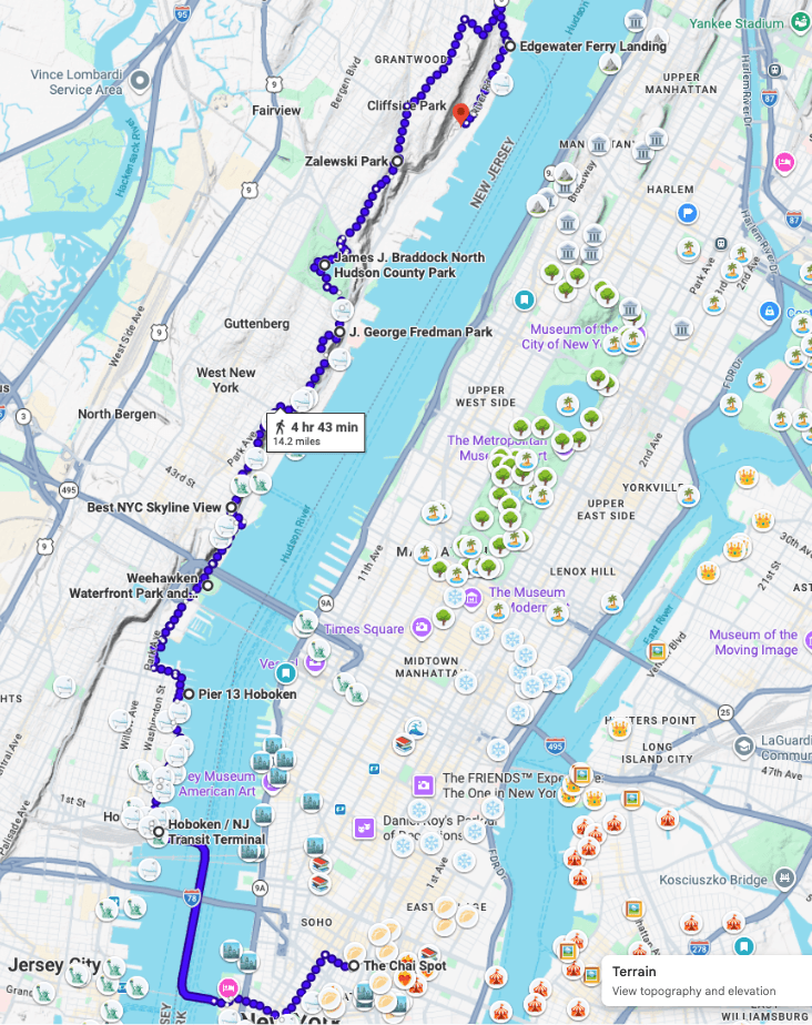 Our adventure will be bookended by the cozy vibes of the Chai Spot tea lounge and the soothing baths of Sojo spa. On our way, we’ll pass through Manhattan’s financial district, ride the Path train under the Hudson River, then wind our way on foot through Jersey City, Hoboken, Weehawken, West New York, and Cliffside Park.