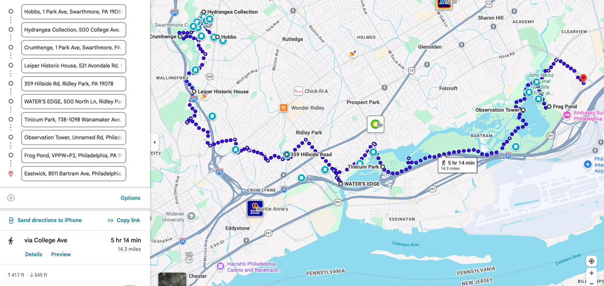 On Sunday August 3rd 2025, we'll be trekking the forests, gardens, and riverfronts of West Philly, starting at the north end of Cobb's Creek, crossing the new pedestrian bridge at Gray's Ferry, and wrapping up with sunset on the Schuylkill at Cira Green.